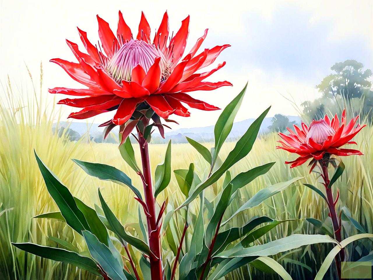形态特征 :帝王花植株成熟时高约 1 米,部分因生境不同,植株高度在 0.35 米到 2 米不等,整体呈现出灌木的形态 。这种较为高大的植株形态也是木本植物的常见特征,与草本植物通常较为矮小、纤细的形态有所区别。